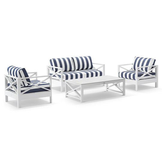 Experience unparalleled comfort with the Kansas 2+1+1 seater Outdoor Aluminium Lounge Set, inspired by the timeless elegance of Hamptons style. Complete with a coffee table, this set will transport you to a world of luxury and relaxation.